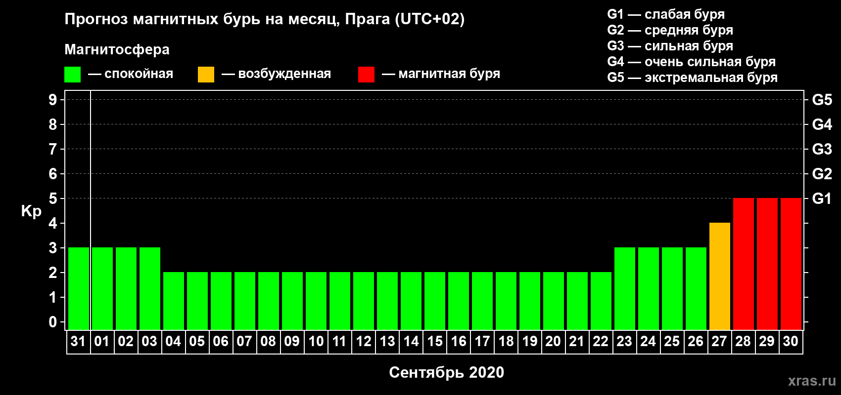 Прогноз магнитных бурь в Праге — 31 августа 2020 года
