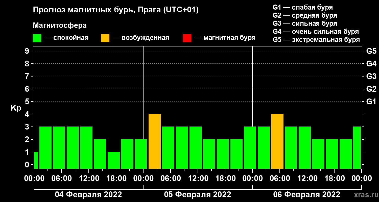 Прогноз магнитных бурь в Праге — 4 февраля 2022 года