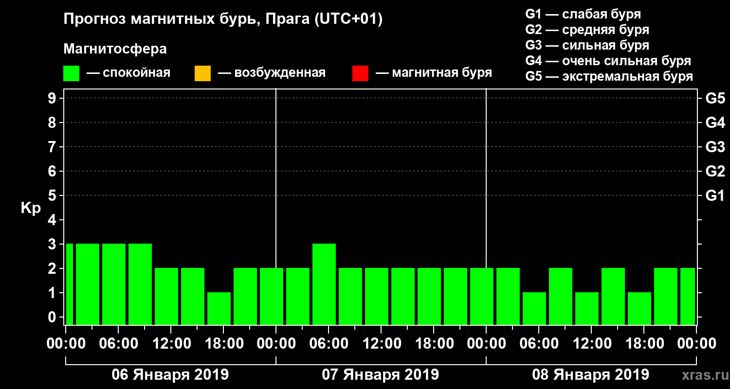 Прогноз магнитных бурь в Праге — 6 января 2019 года