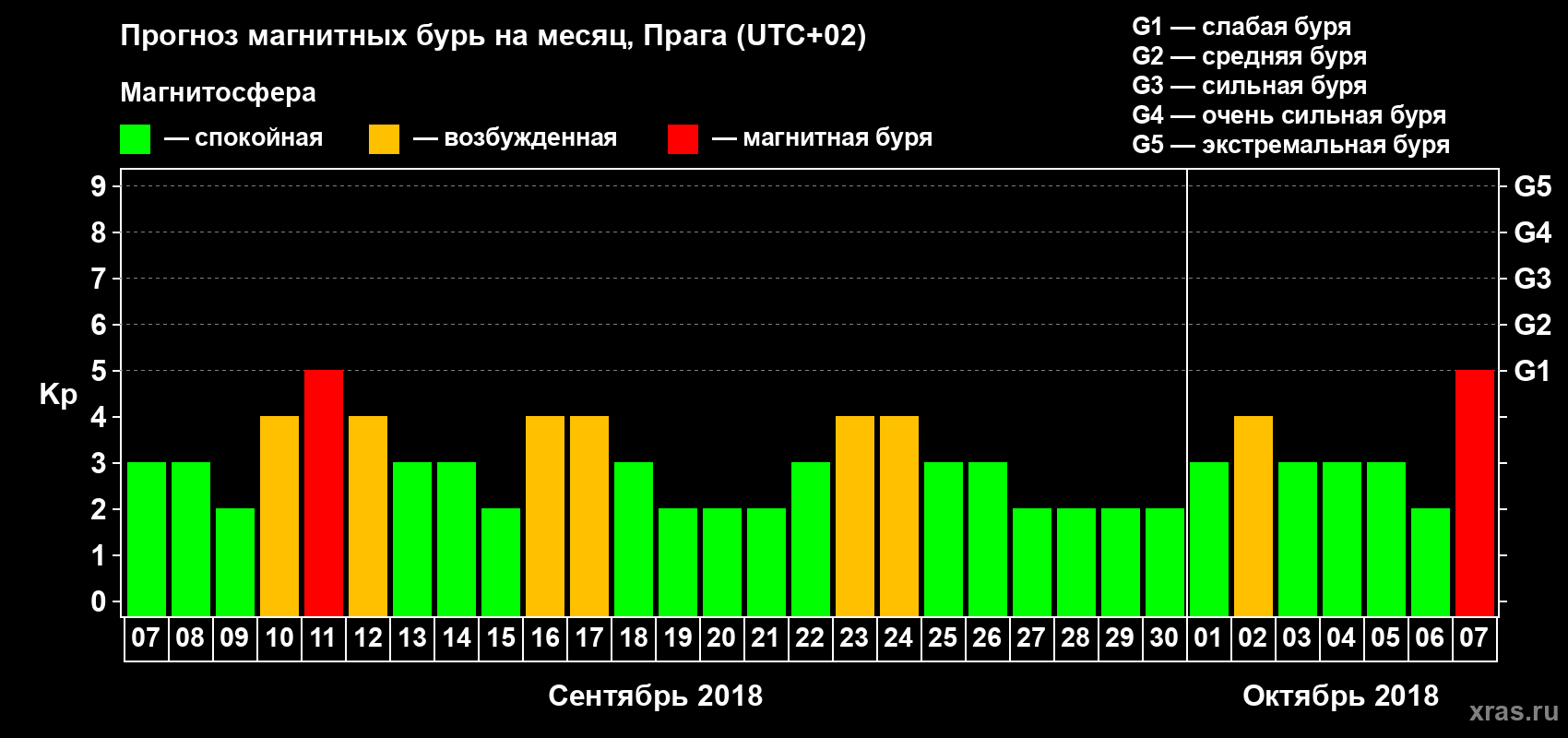 Прогноз магнитных бурь в Праге — 7 сентября 2018 года