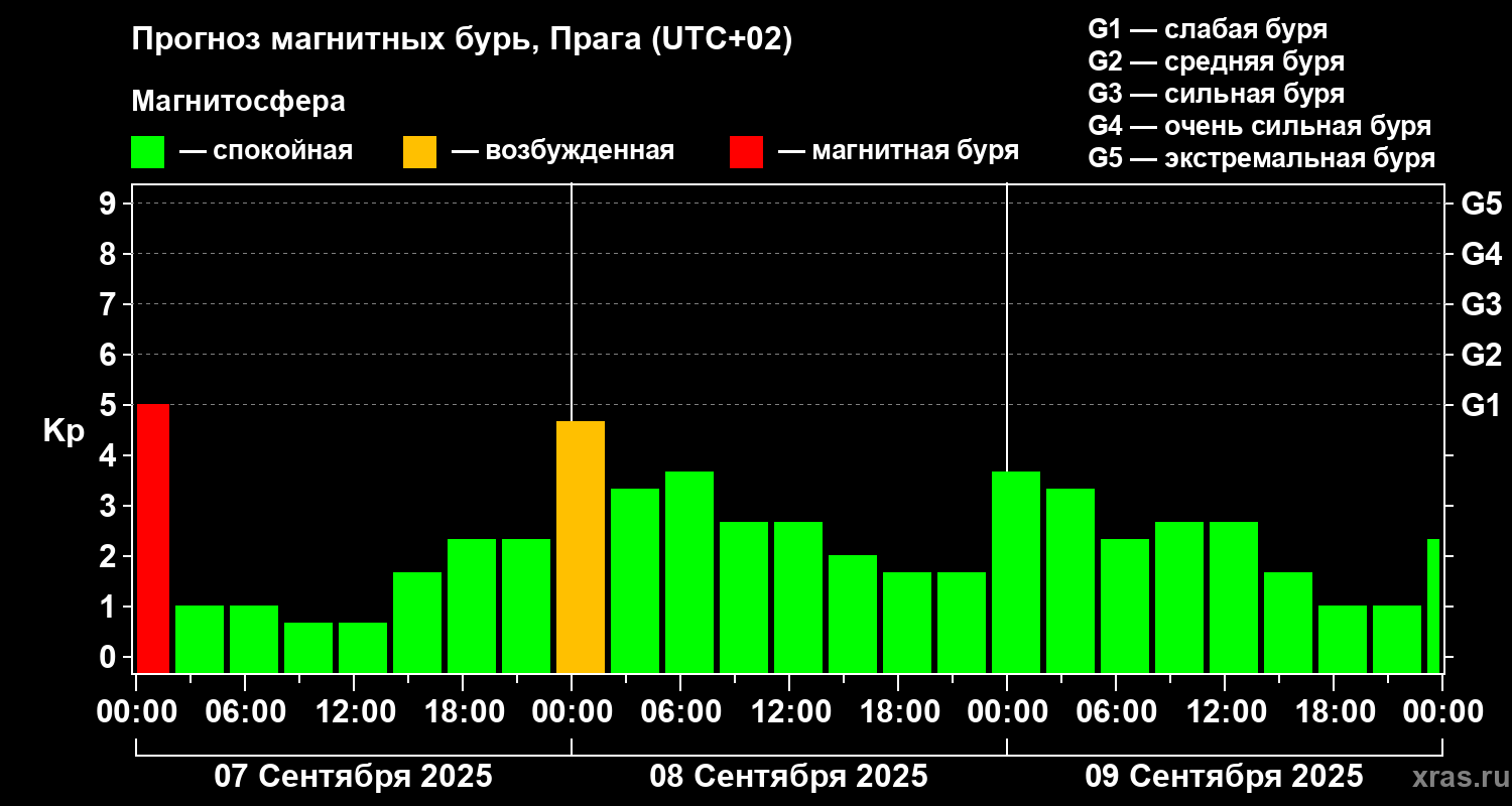 Прогноз магнитных бурь в Праге на 7 сентября 2025 года