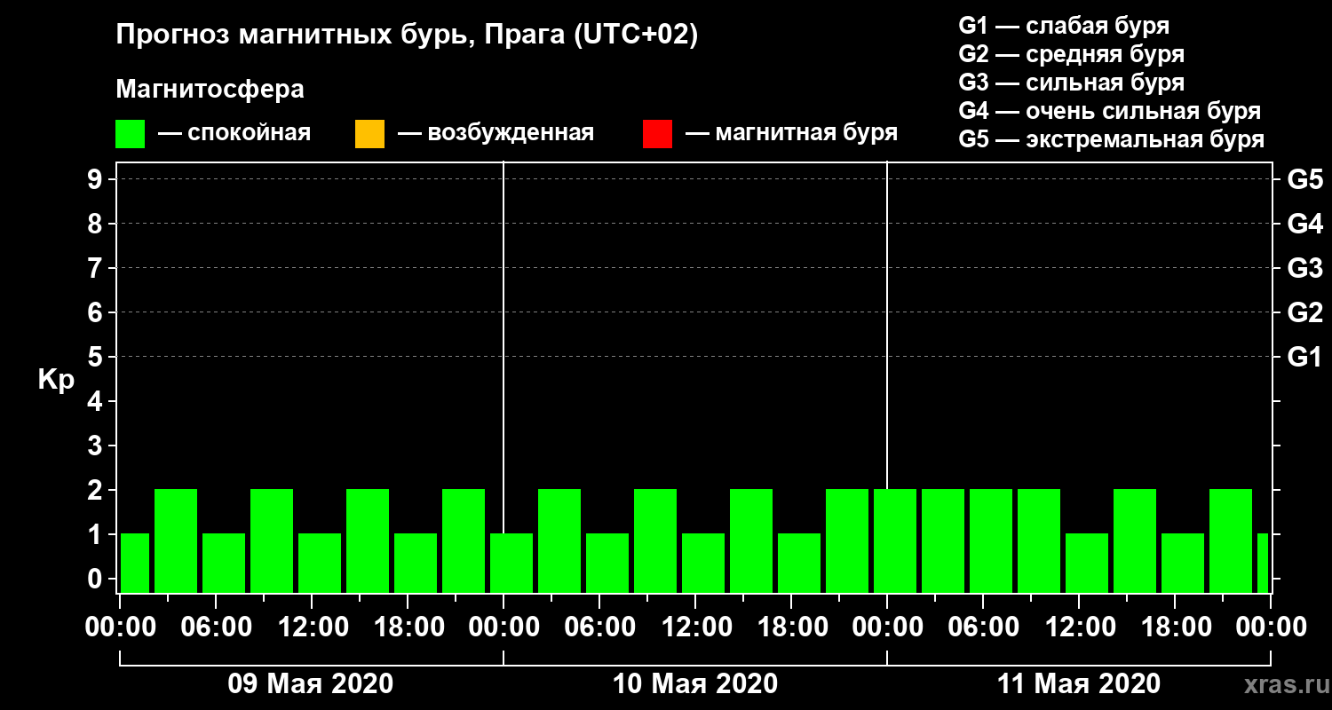 Прогноз магнитных бурь в Праге на 9 мая 2020 года
