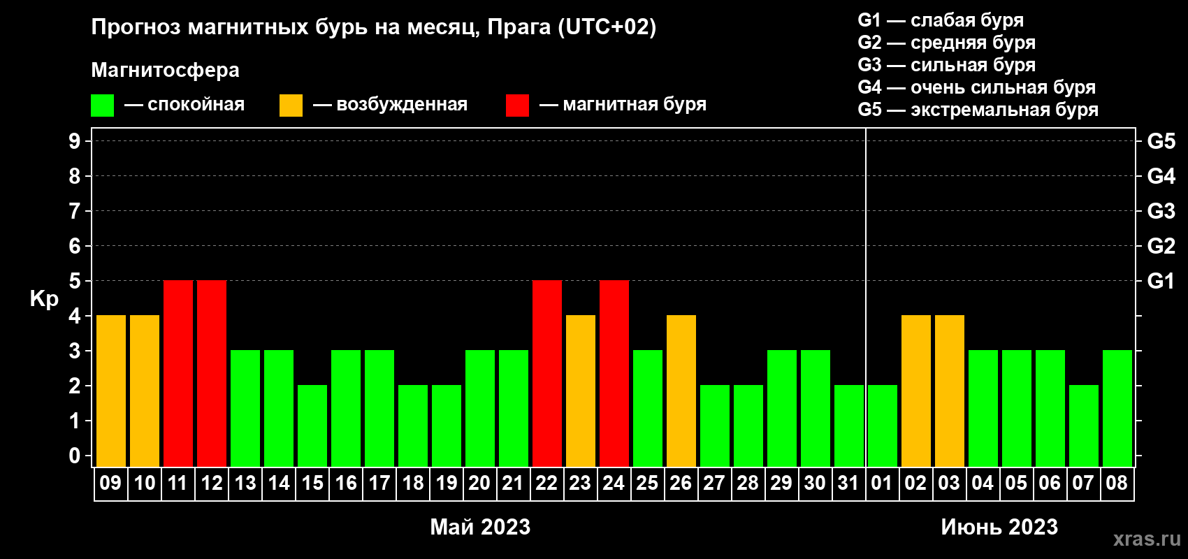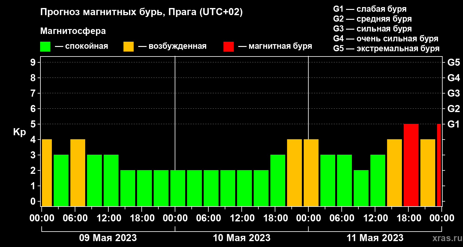 Прогноз магнитных бурь в Праге — 9 мая 2023 года
