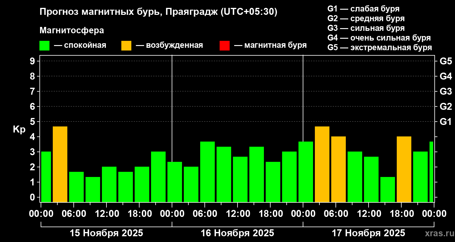 Прогноз магнитных бурь в Праяградже — 15 ноября 2025 года