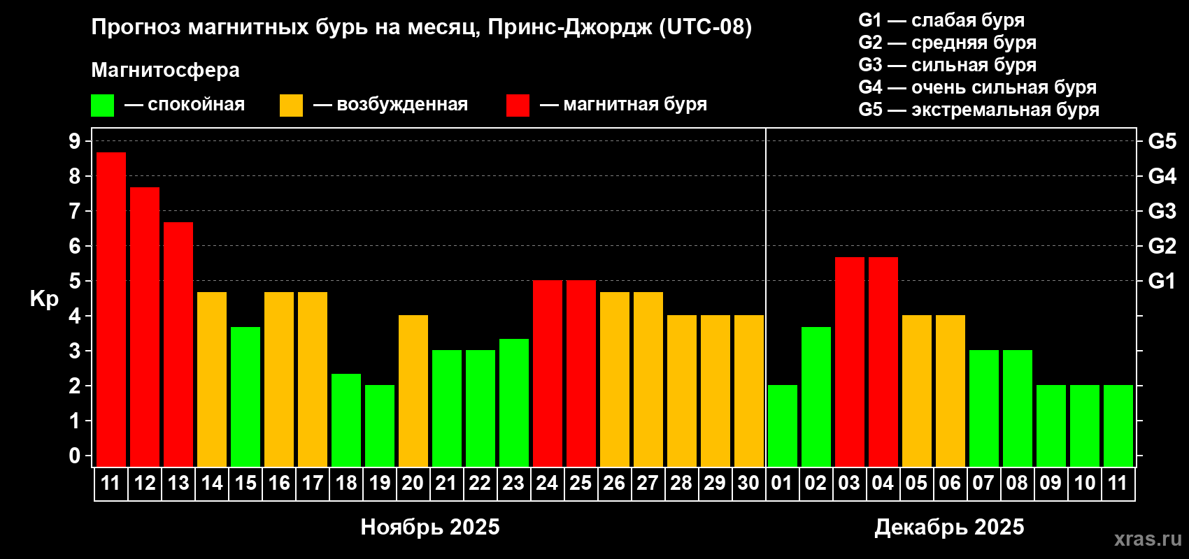 Прогноз магнитных бурь в Принс-Джордже на 11 ноября 2025 года