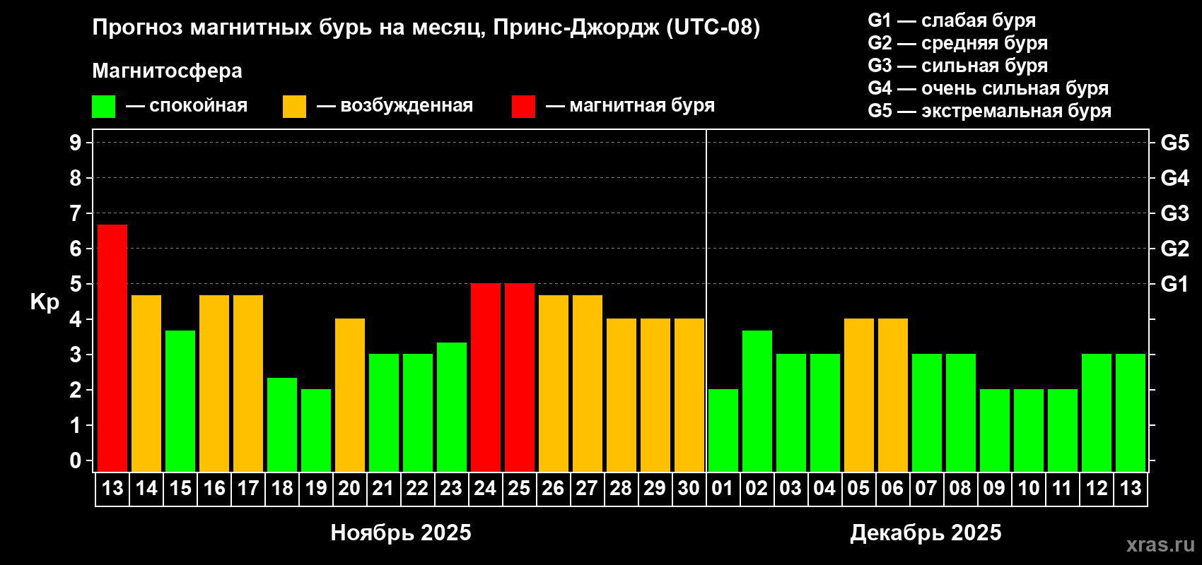 Прогноз магнитных бурь в Принс-Джордже на 13 ноября 2025 года