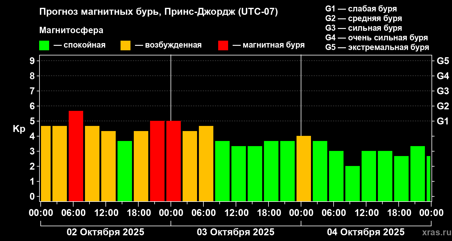 Прогноз магнитных бурь в Принс-Джордже на 2 октября 2025 года