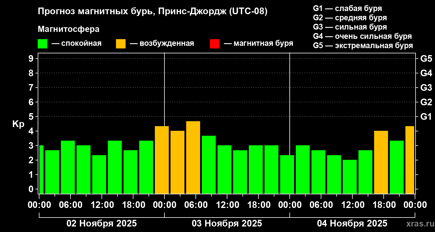 Прогноз магнитных бурь в Принс-Джордже на 2 ноября 2025 года