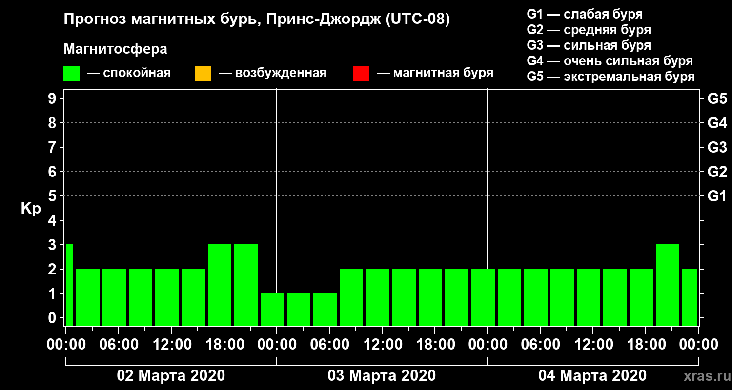 Прогноз магнитных бурь в Принс-Джордже на 2 марта 2020 года