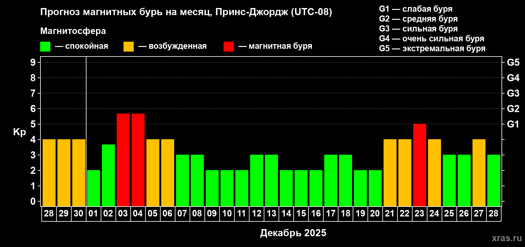 Прогноз магнитных бурь в Принс-Джордже — 28 ноября 2025 года