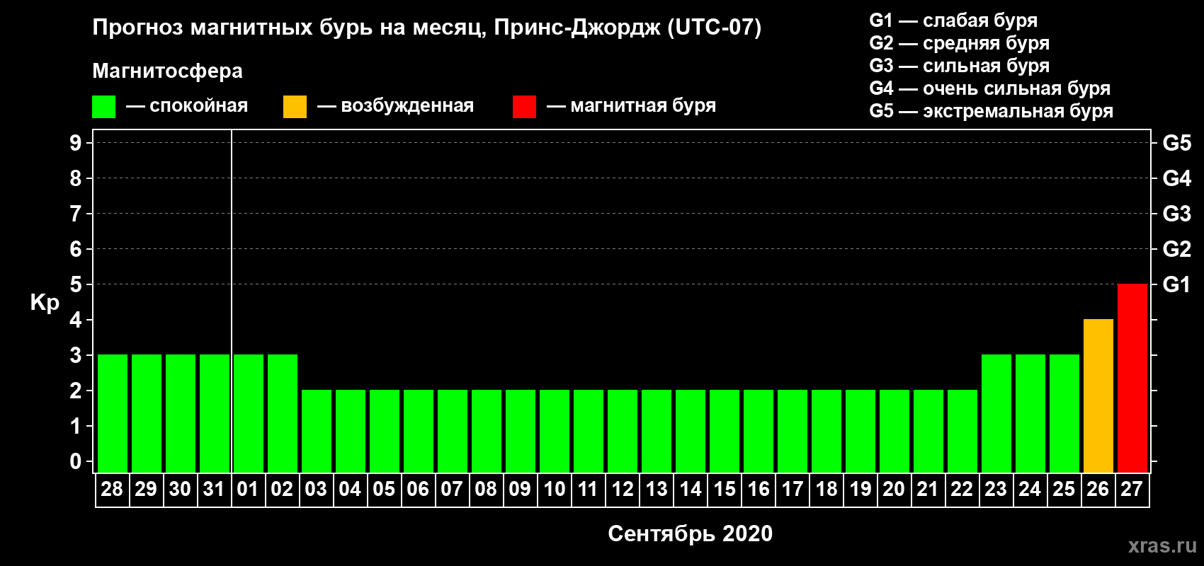Прогноз магнитных бурь в Принс-Джордже — 28 августа 2020 года