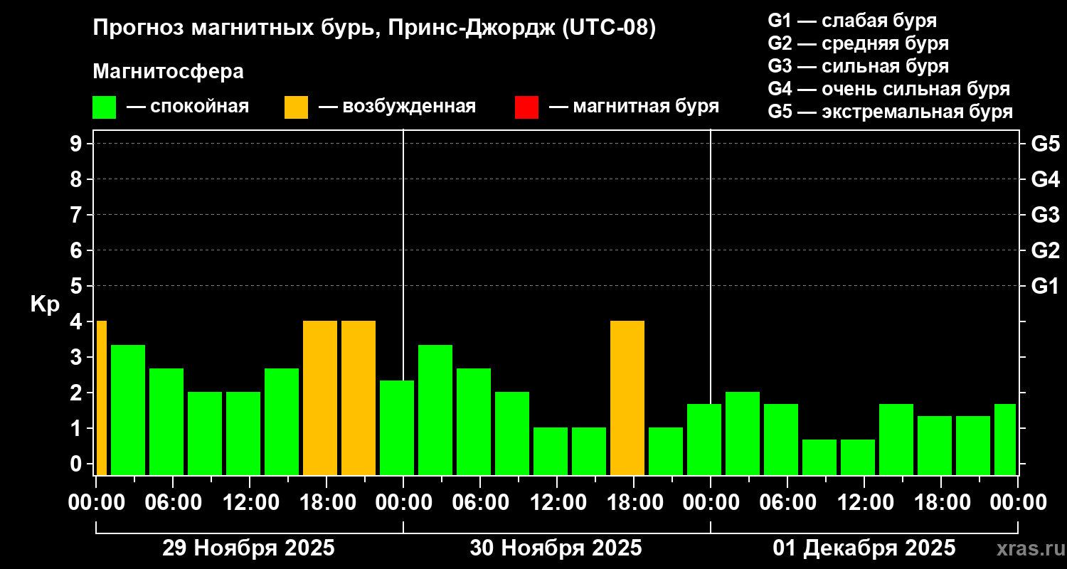 Прогноз магнитных бурь в Принс-Джордже на 29 ноября 2025 года