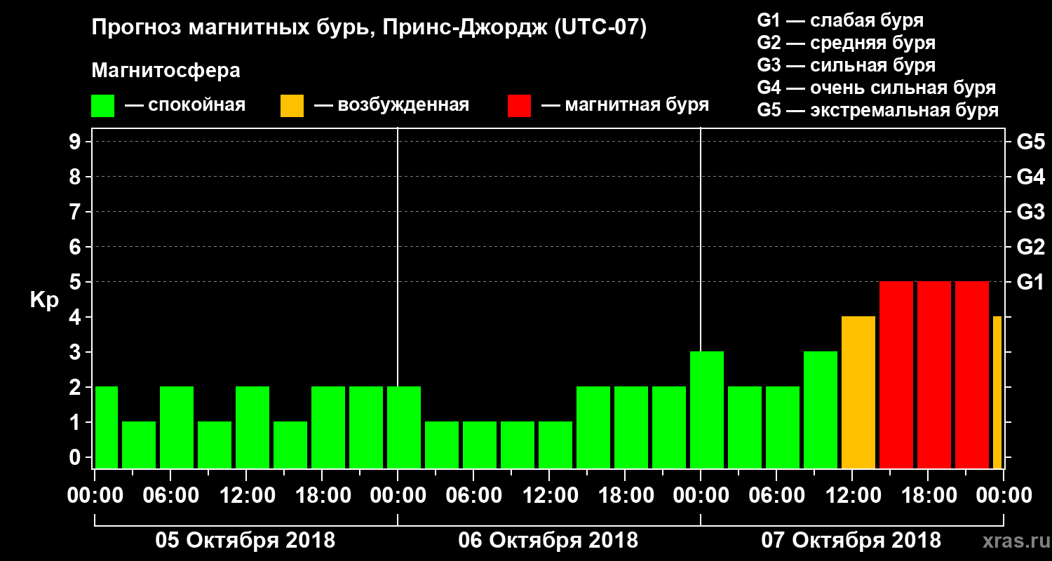 Прогноз магнитных бурь в Принс-Джордже на 5 октября 2018 года