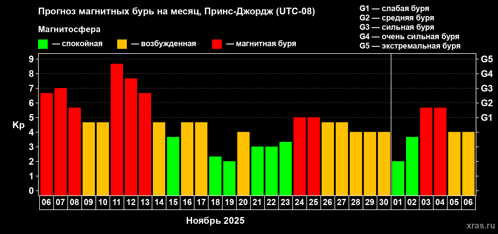Прогноз магнитных бурь в Принс-Джордже — 6 ноября 2025 года
