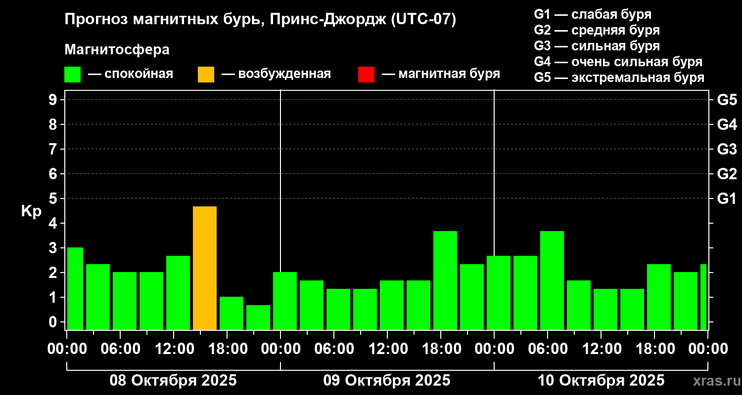 Прогноз магнитных бурь в Принс-Джордже на 8 октября 2025 года
