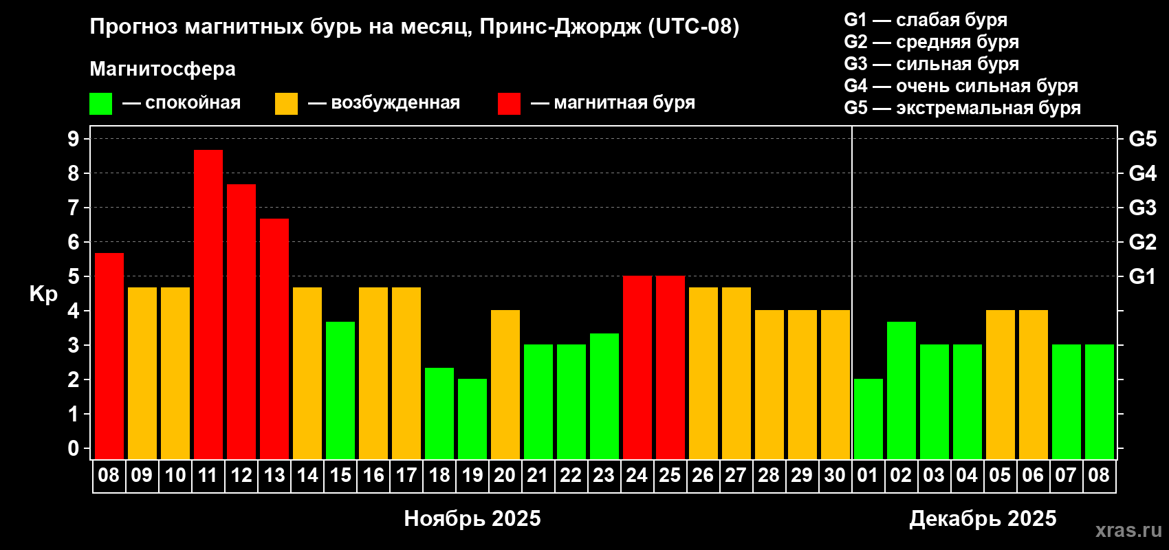 Прогноз магнитных бурь в Принс-Джордже на 8 ноября 2025 года