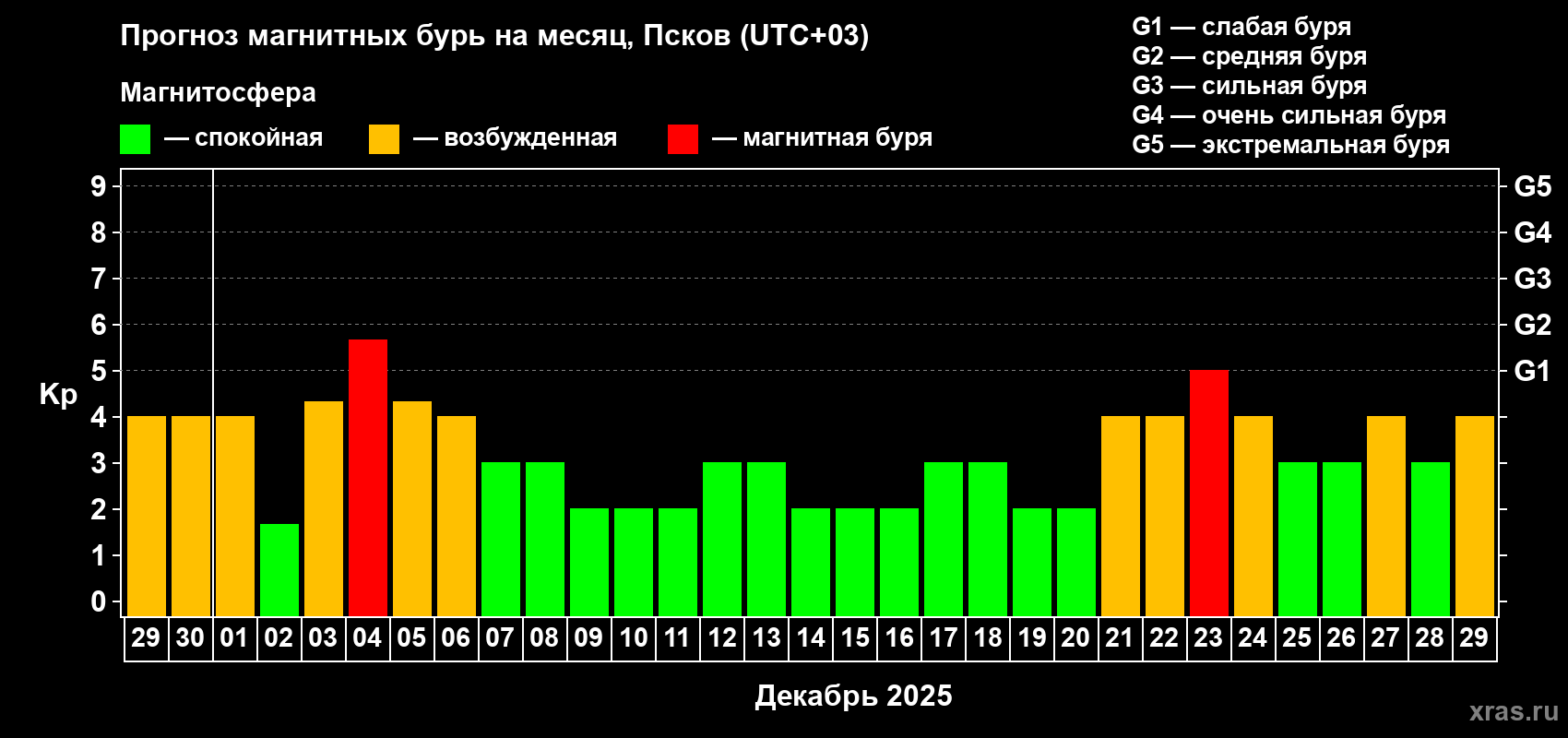 Прогноз магнитных бурь в Пскове — 29 ноября 2025 года
