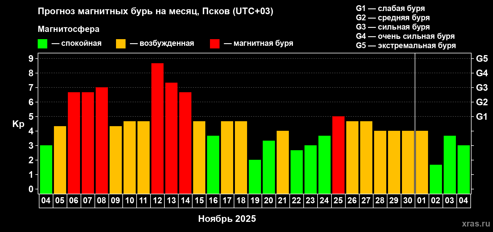 Прогноз магнитных бурь в Пскове — 4 ноября 2025 года