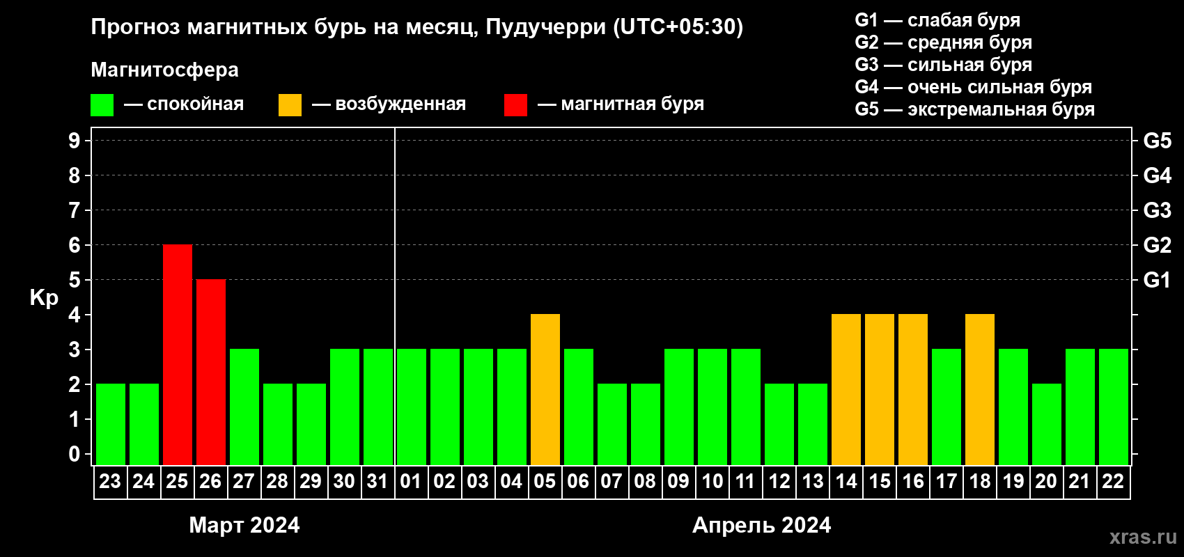 Прогноз магнитных бурь Пудучерри на 23 марта 2024 года