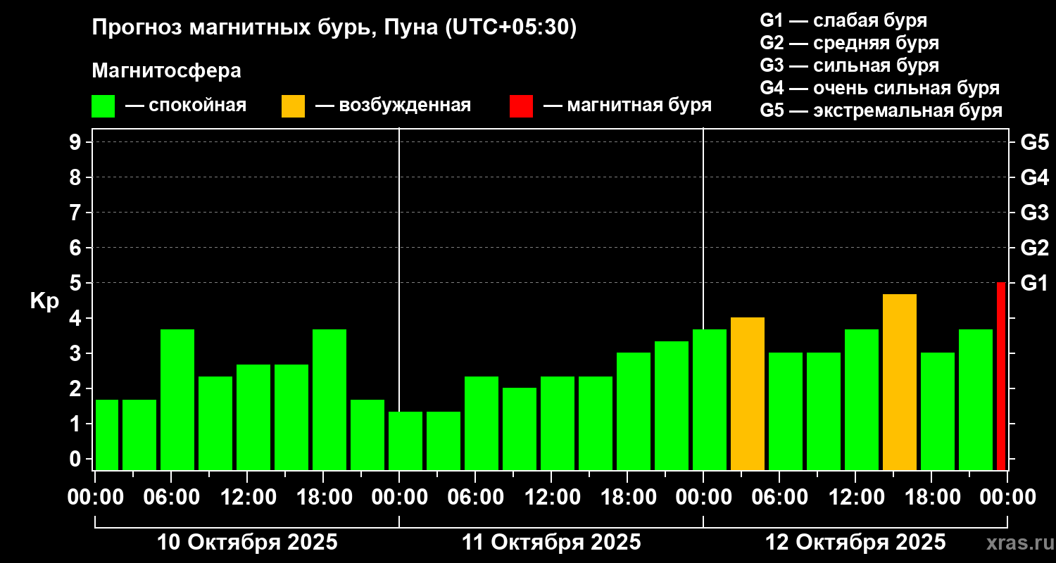 Прогноз магнитных бурь в Пуне — 10 октября 2025 года