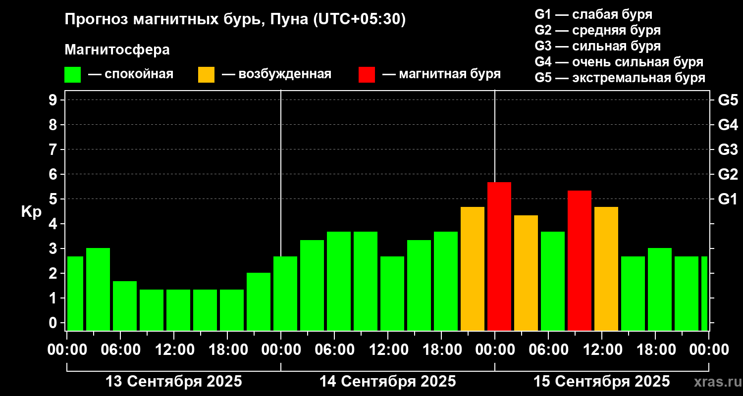 Прогноз магнитных бурь в Пуне на 13 сентября 2025 года