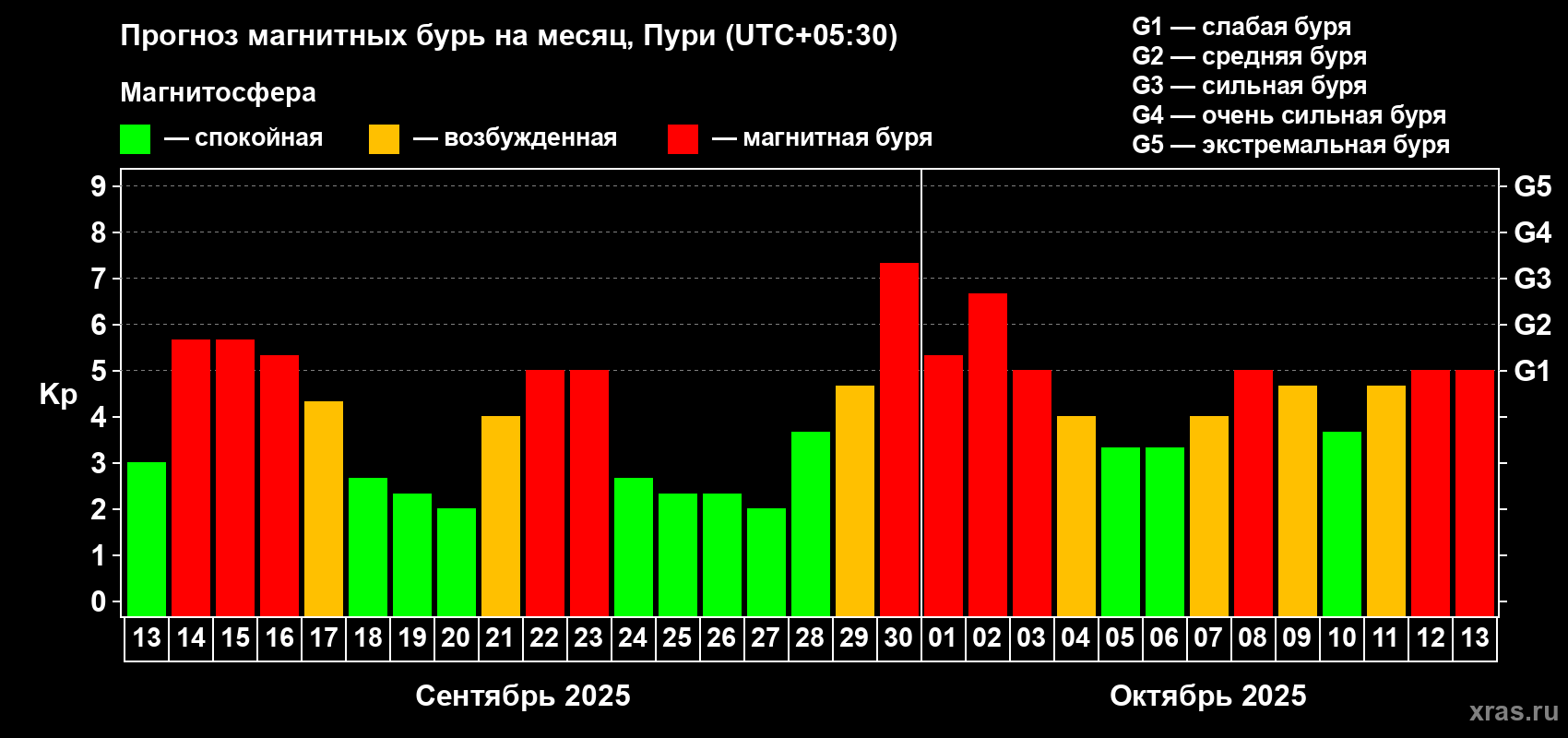Прогноз магнитных бурь Пури на 13 сентября 2025 года