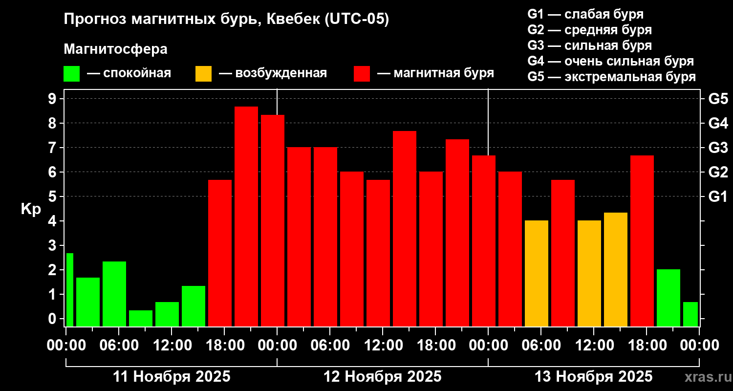 Прогноз магнитных бурь в Квебеке — 11 ноября 2025 года