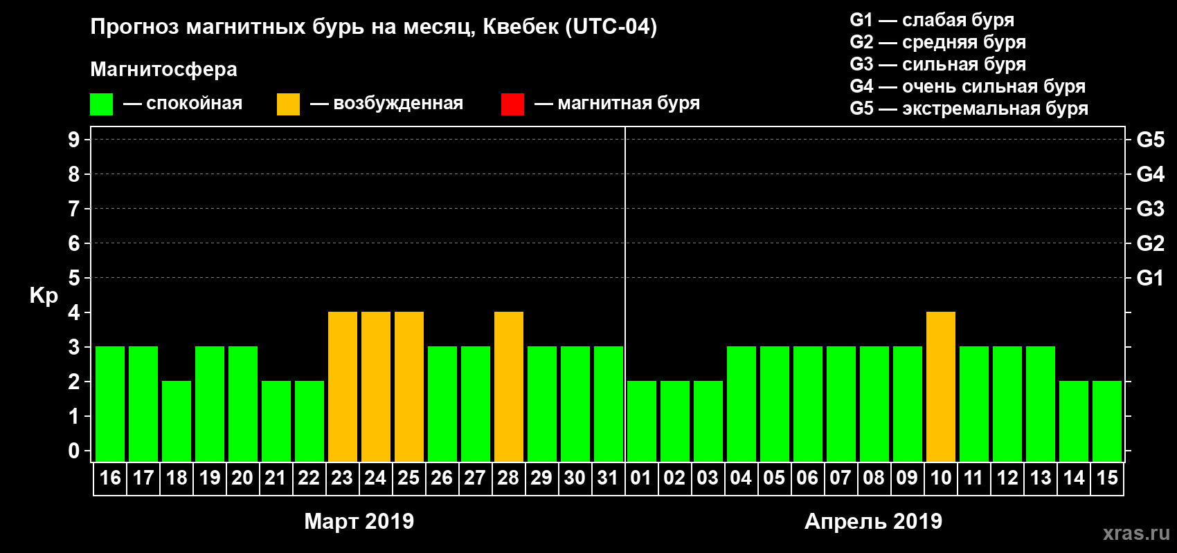 Прогноз максимального суточного геомагнитного индекса Kp на 1 месяц (31 день) с 16 марта по 15 апреля 2019 г