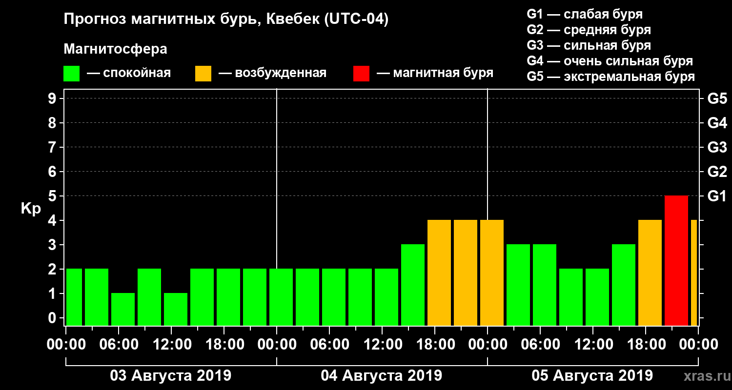 Прогноз магнитных бурь в Квебеке на 3 августа 2019 года