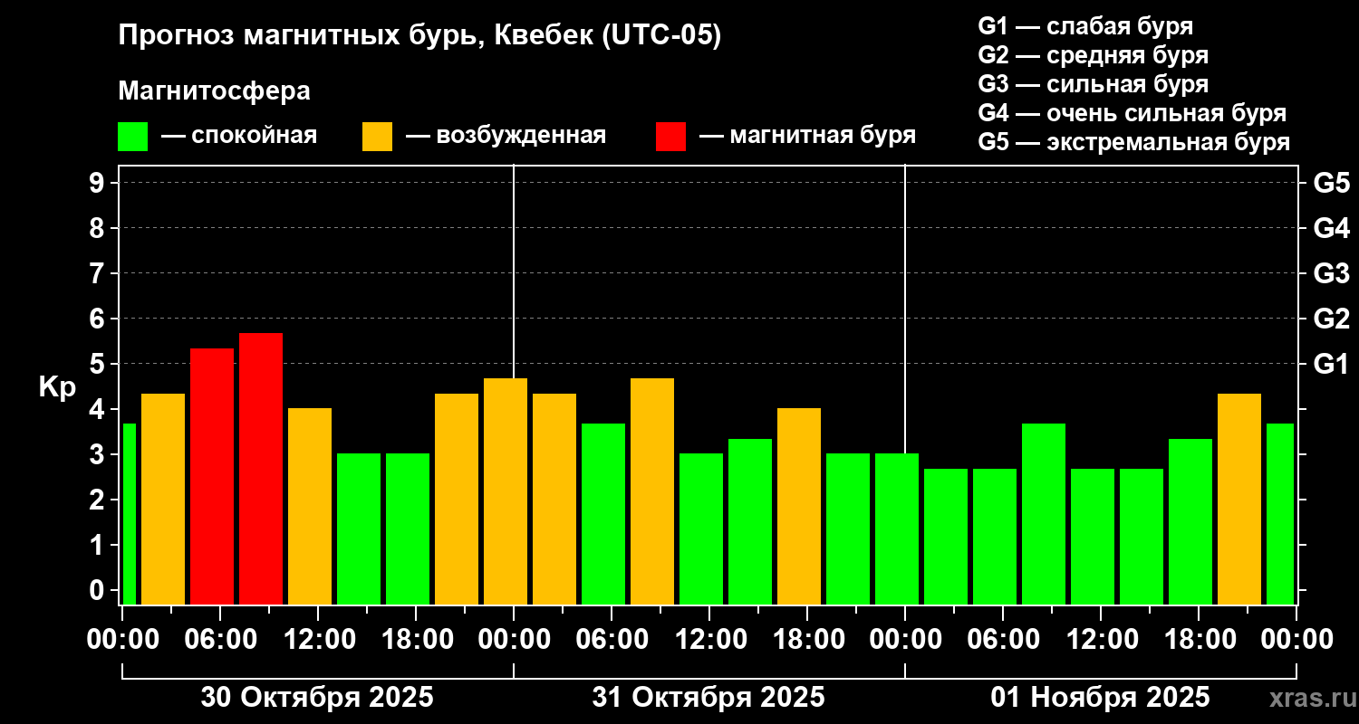 Прогноз магнитных бурь в Квебеке на 30 октября 2025 года