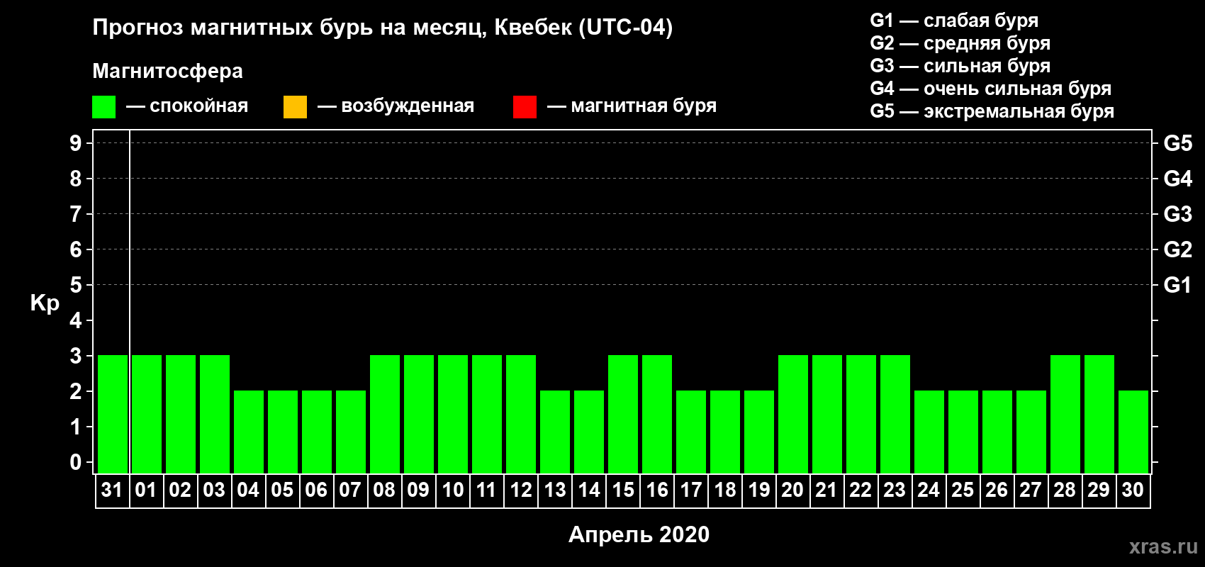 Прогноз магнитных бурь в Квебеке на 31 марта 2020 года