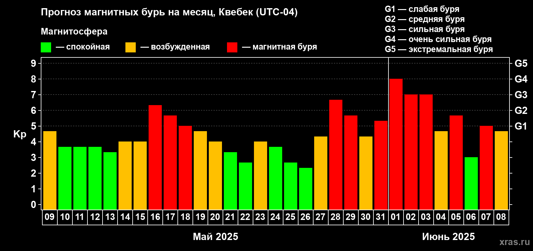 Прогноз магнитных бурь в Квебеке — 9 мая 2025 года
