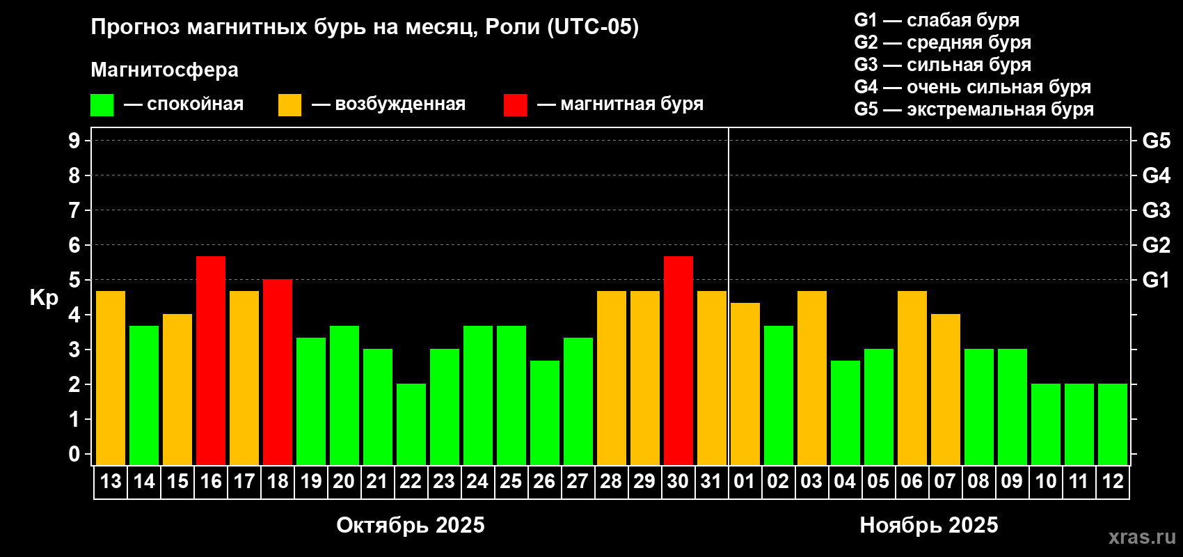 Прогноз магнитных бурь Роли — 13 октября 2025 года