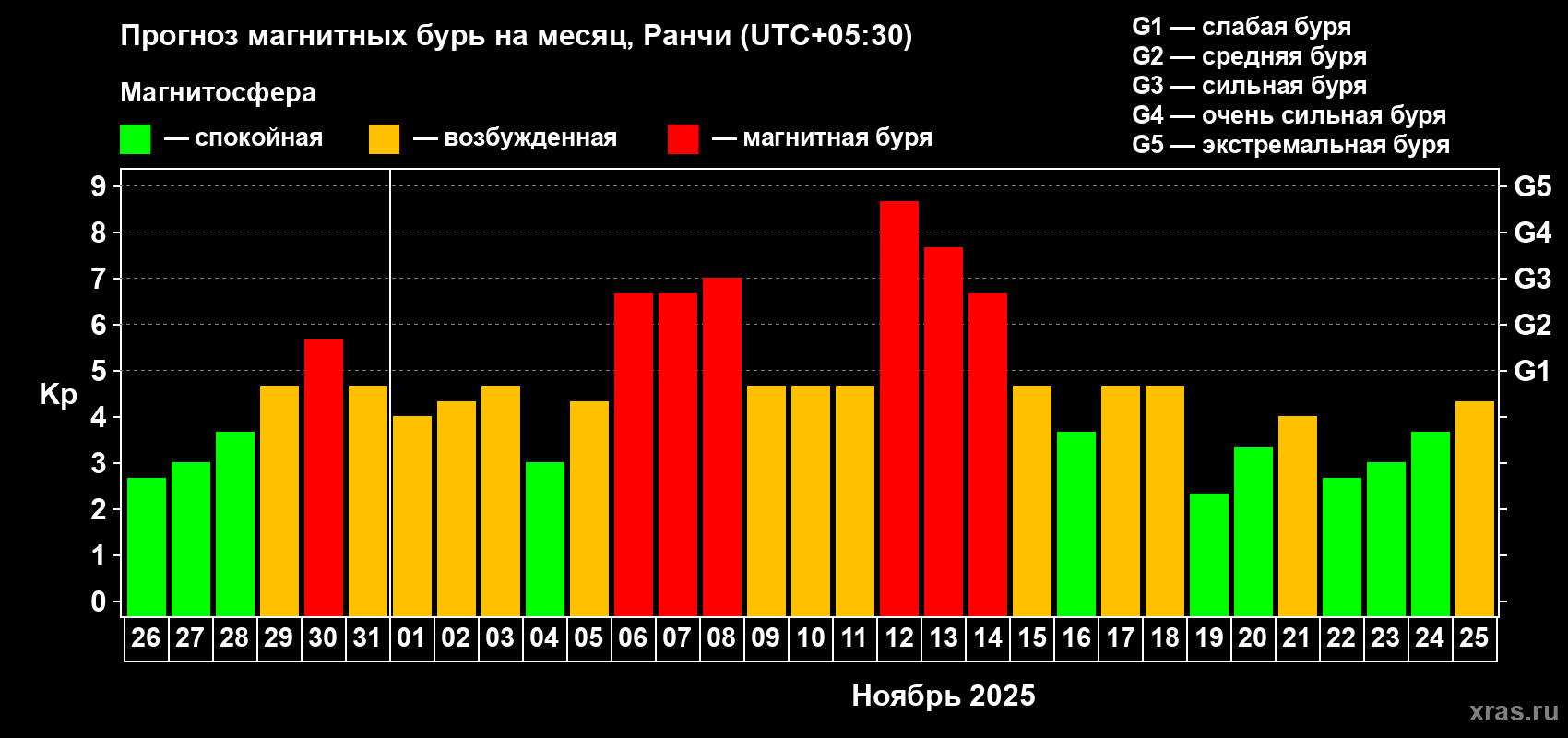Прогноз магнитных бурь Ранчи на 26 октября 2025 года