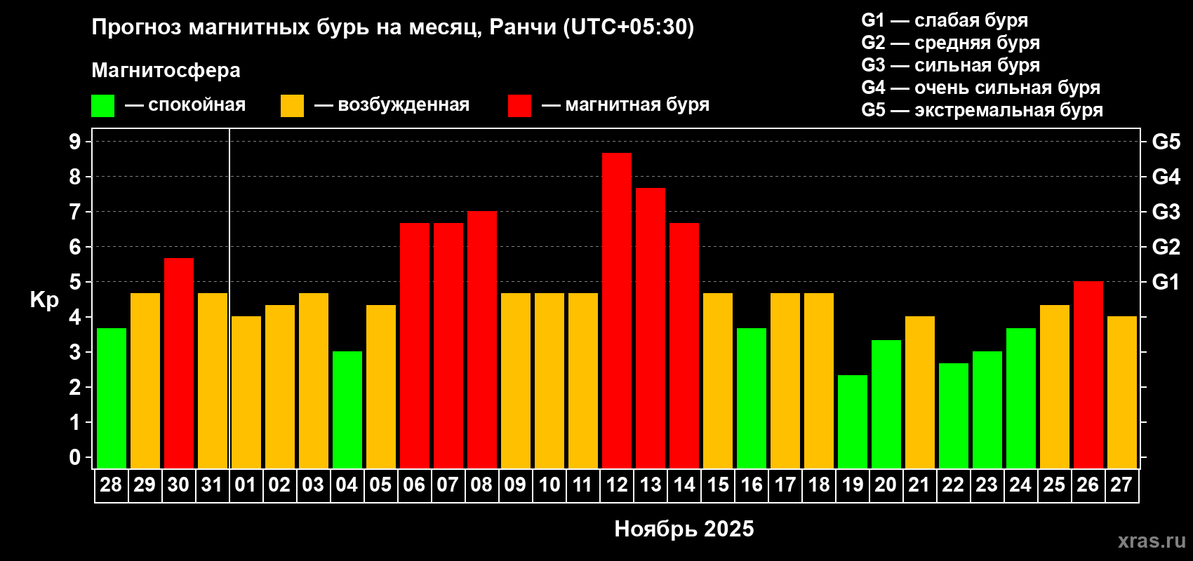 Прогноз магнитных бурь Ранчи на 28 октября 2025 года