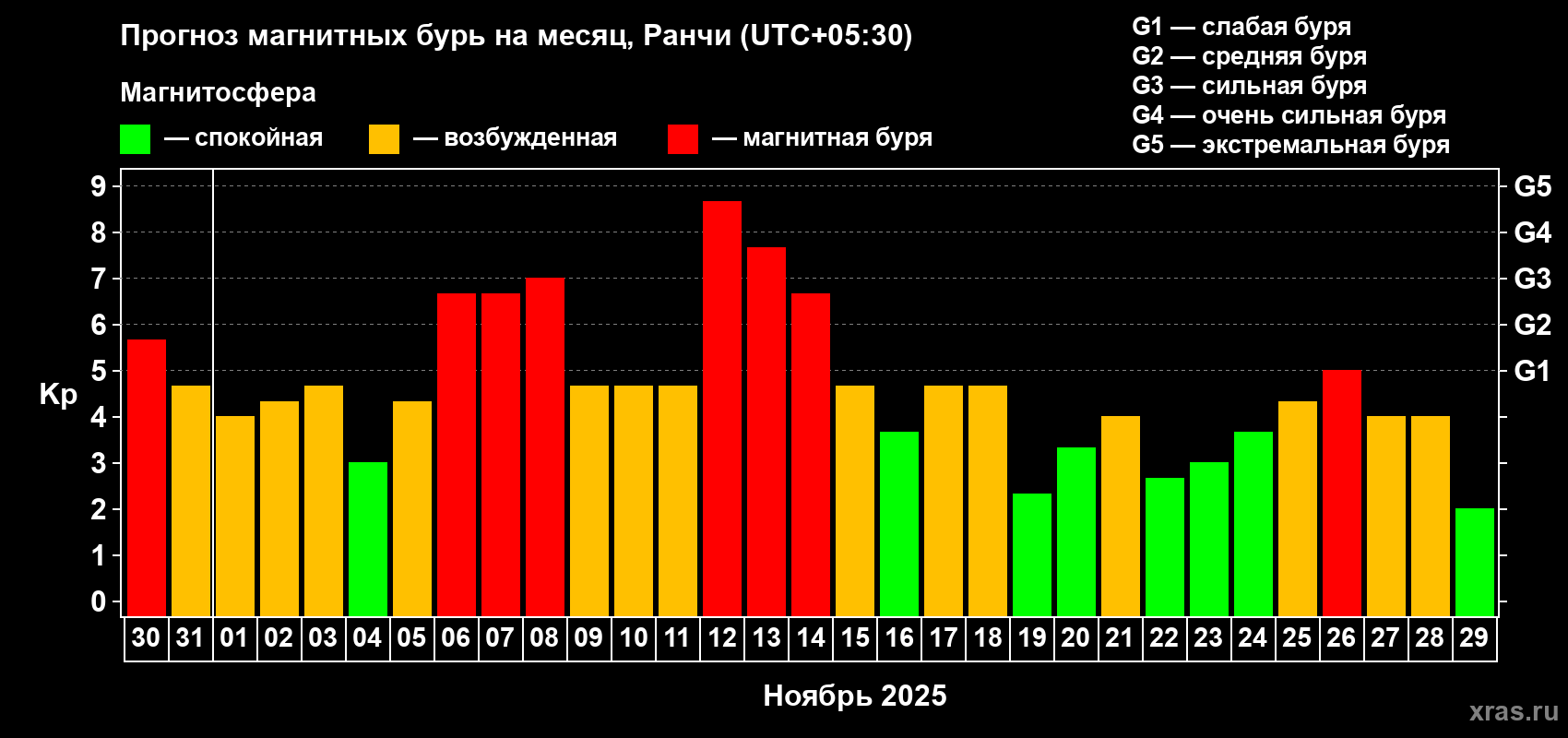 Прогноз магнитных бурь Ранчи на 30 октября 2025 года