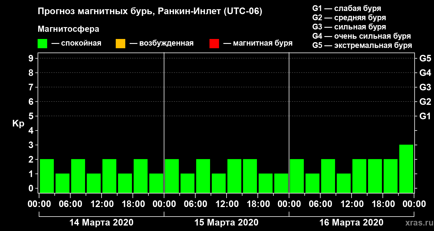 Прогноз магнитных бурь в Ранкин-Инлете на 14 марта 2020 года