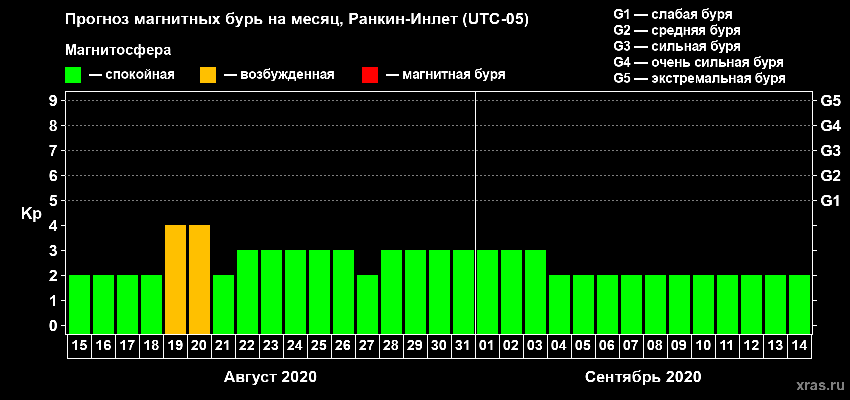 Прогноз магнитных бурь в Ранкин-Инлете — 15 августа 2020 года