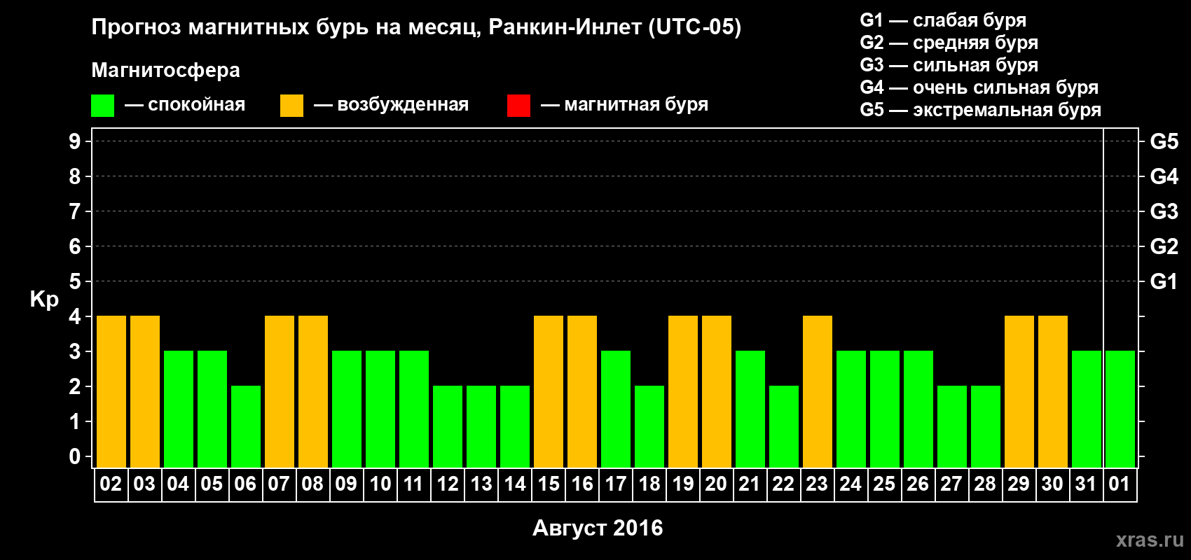 Прогноз магнитных бурь в Ранкин-Инлете — 2 августа 2016 года