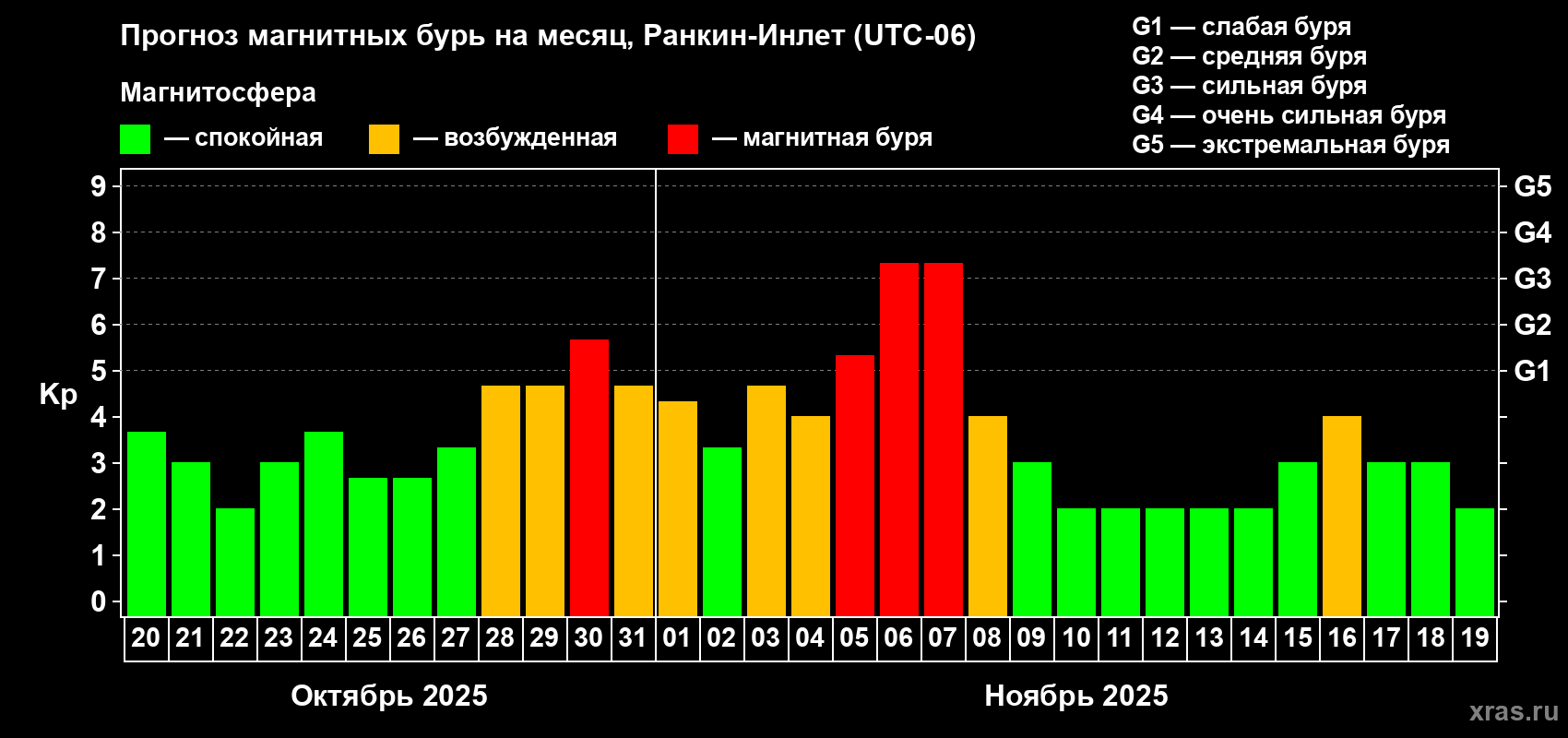 Прогноз магнитных бурь в Ранкин-Инлете на 20 октября 2025 года