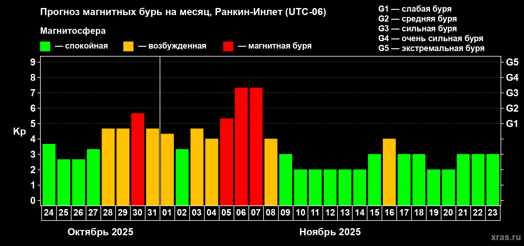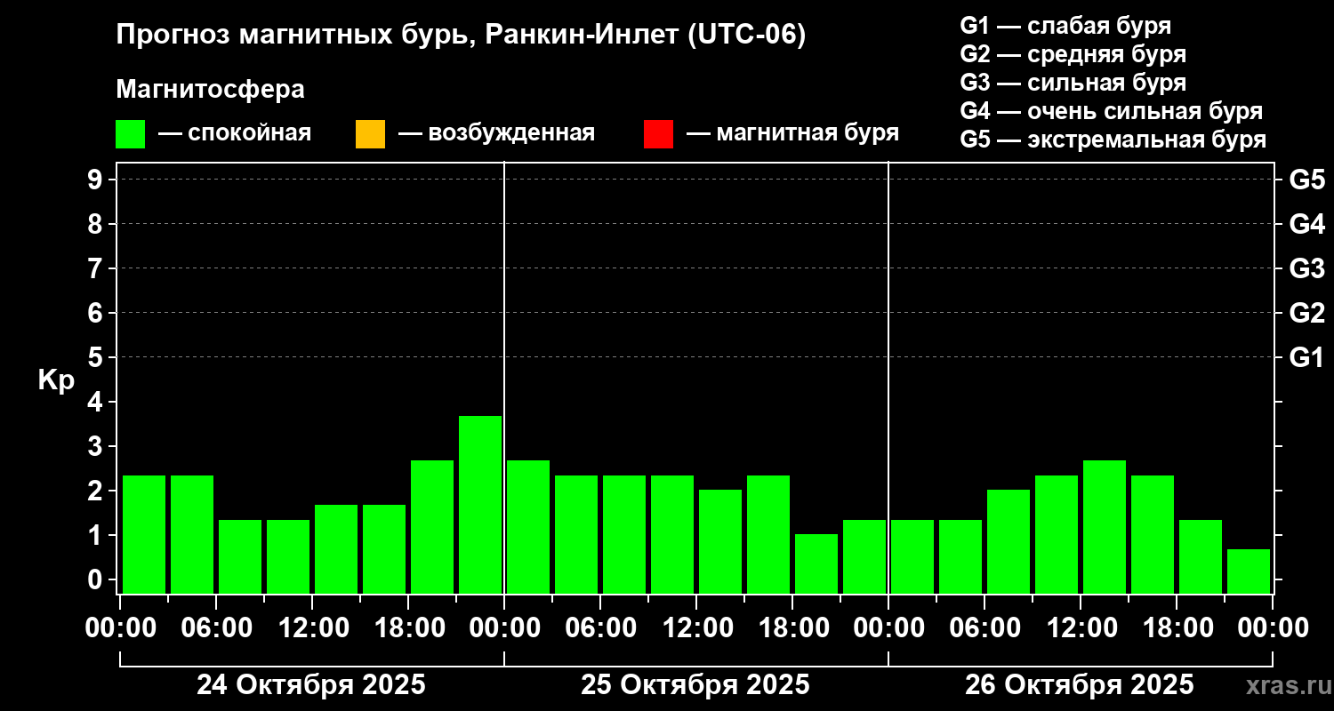 Прогноз магнитных бурь в Ранкин-Инлете на 24 октября 2025 года