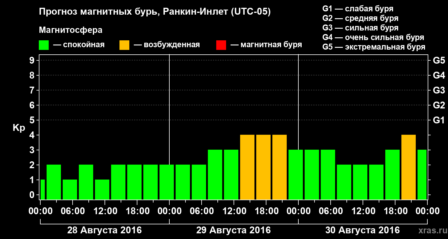 Прогноз магнитных бурь в Ранкин-Инлете — 28 августа 2016 года
