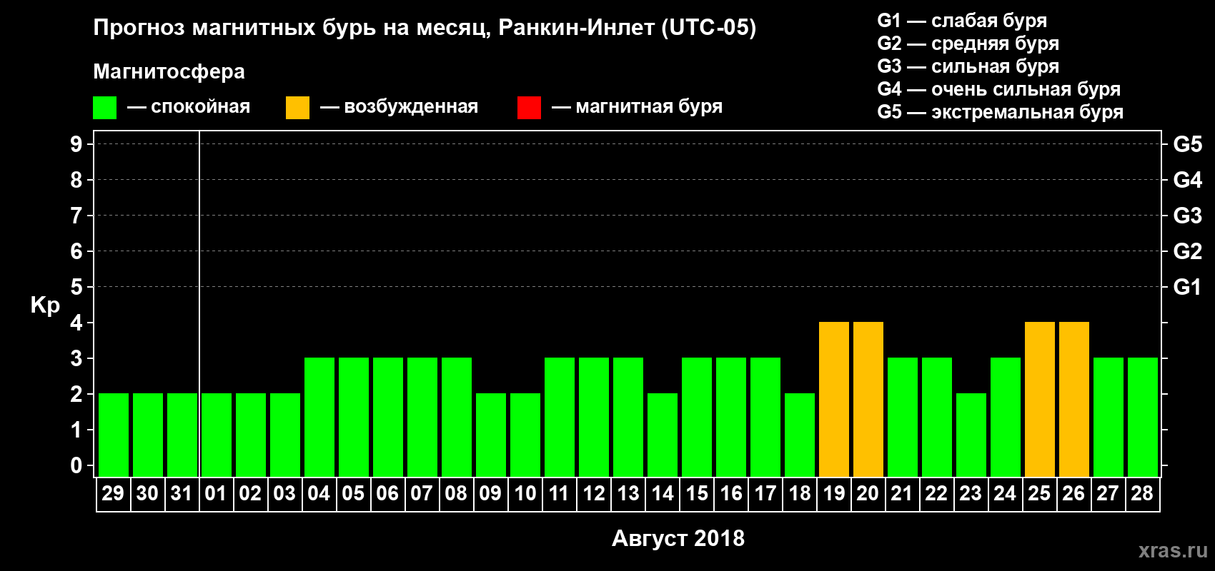 Прогноз магнитных бурь в Ранкин-Инлете — 29 июля 2018 года