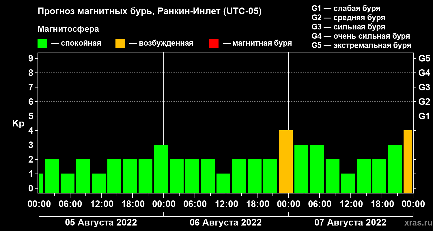 Прогноз магнитных бурь в Ранкин-Инлете на 5 августа 2022 года