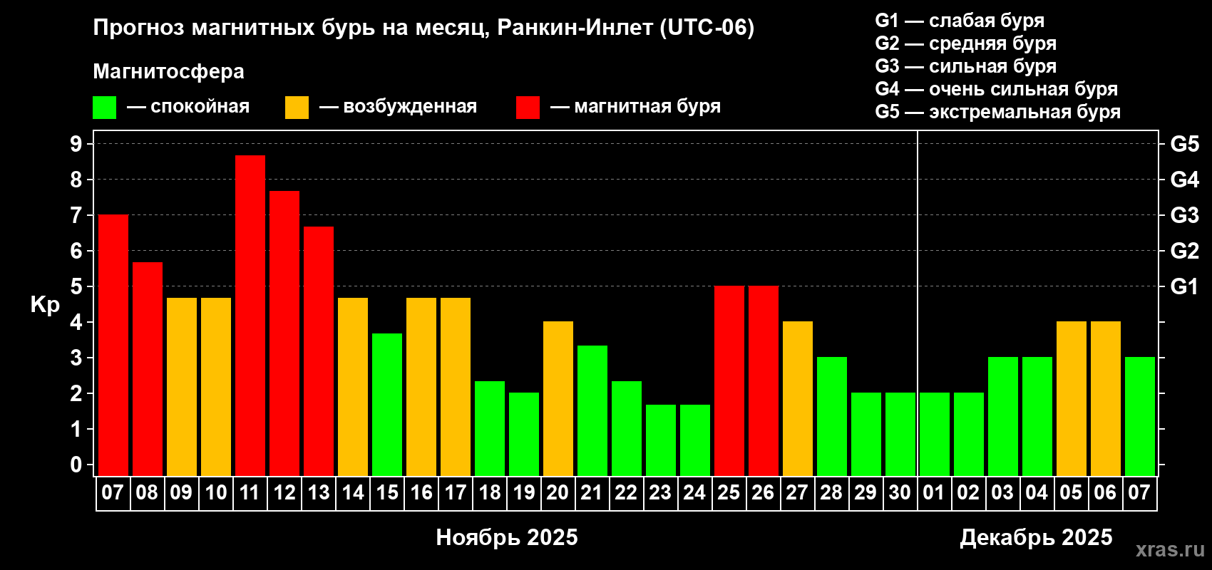 Прогноз магнитных бурь в Ранкин-Инлете — 7 ноября 2025 года