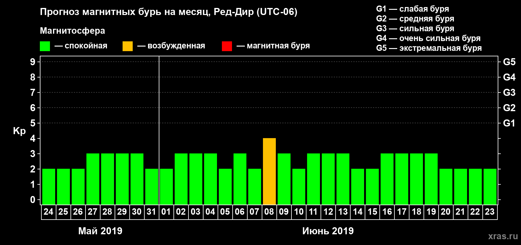 Прогноз магнитных бурь в Ред-Дире на 24 мая 2019 года