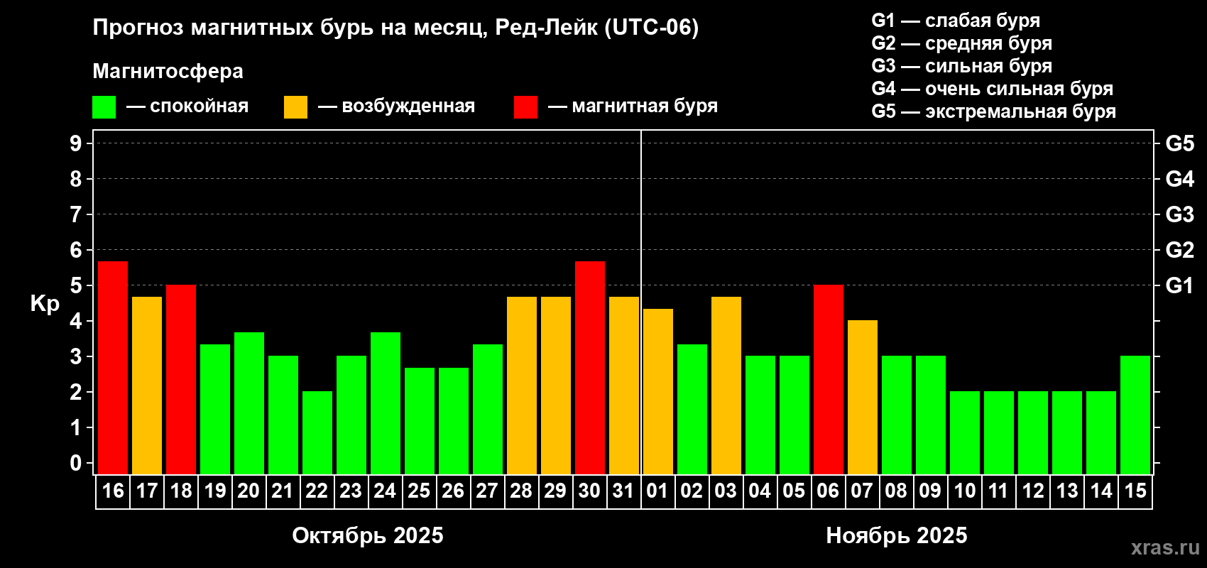 Прогноз магнитных бурь в Ред-Лейке — 16 октября 2025 года