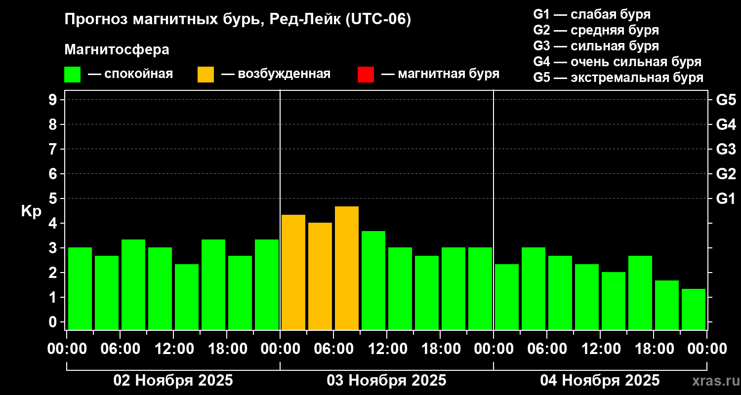 Прогноз магнитных бурь в Ред-Лейке на 2 ноября 2025 года