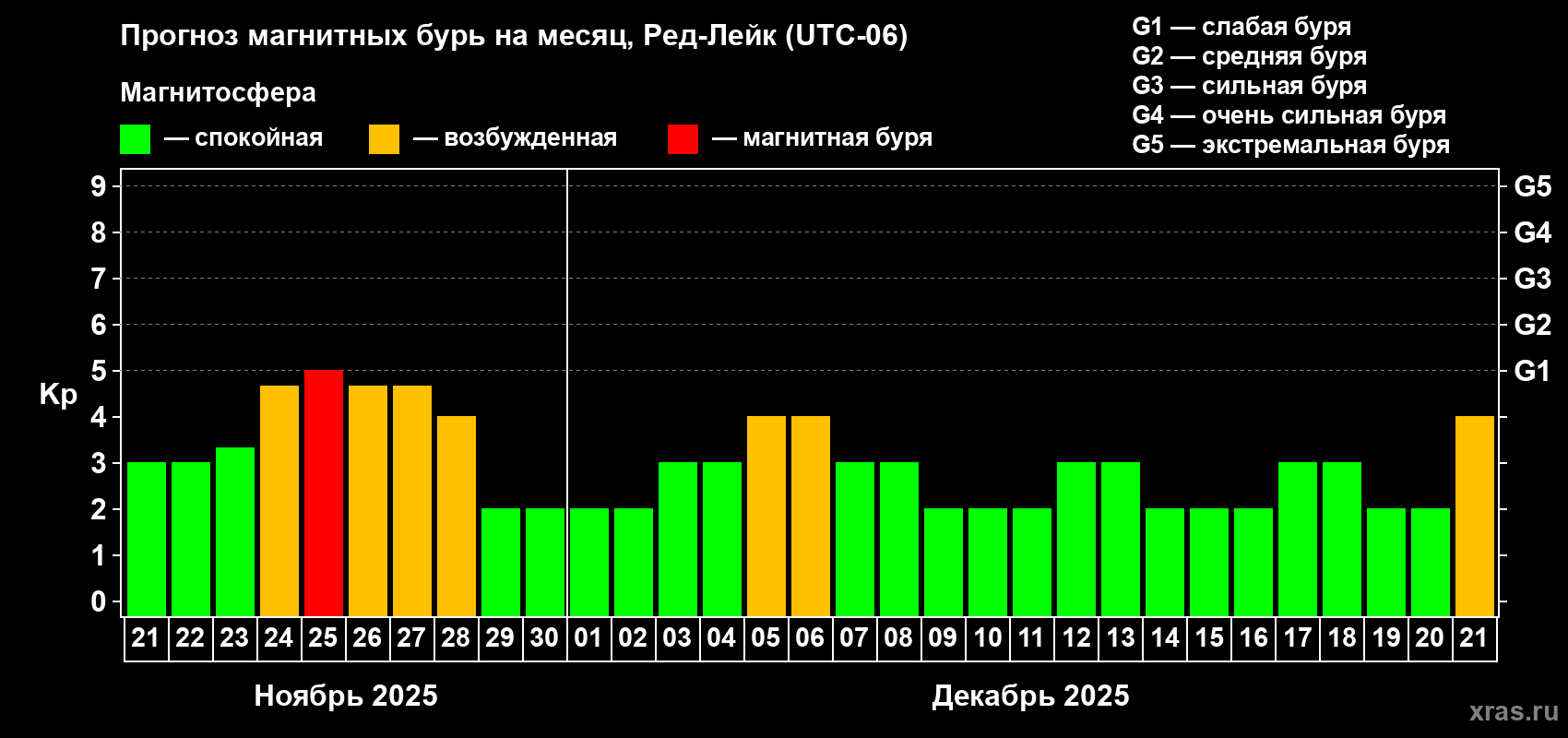 Прогноз магнитных бурь в Ред-Лейке — 21 ноября 2025 года