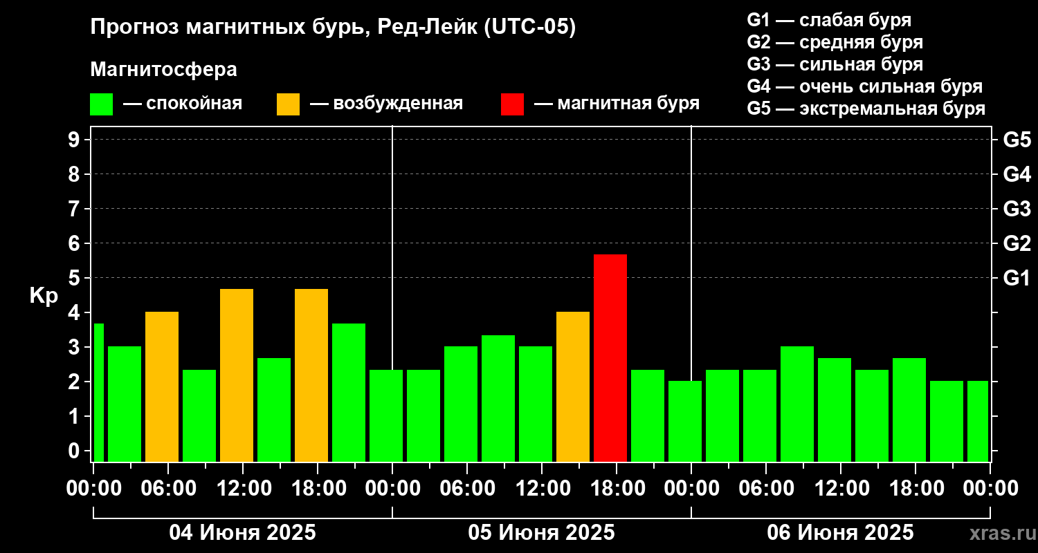 Прогноз магнитных бурь в Ред-Лейке — 4 июня 2025 года